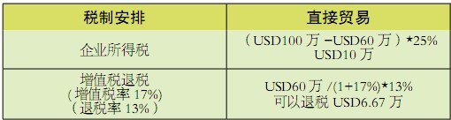 假如美國(guó)客戶下單USD(美元)100萬(wàn)給大陸公司。假定這批貨物的采購(gòu)成本價(jià)是USD60萬(wàn),利潤(rùn)就是USD40萬(wàn)?,F(xiàn)在通過(guò)直接貿(mào)易和轉(zhuǎn)口貿(mào)易兩種方式完成這筆交易(參見(jiàn)圖三)。