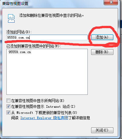 在彈出的兼容性視圖設(shè)置中將交通銀行網(wǎng)址95559.com.cn添加進(jìn)去即可,如下圖:
