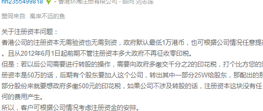 建議一萬(wàn)港元即可,無(wú)需驗(yàn)資,不必要為以后如何轉(zhuǎn)股那些多付千分之2的稅金給政府答