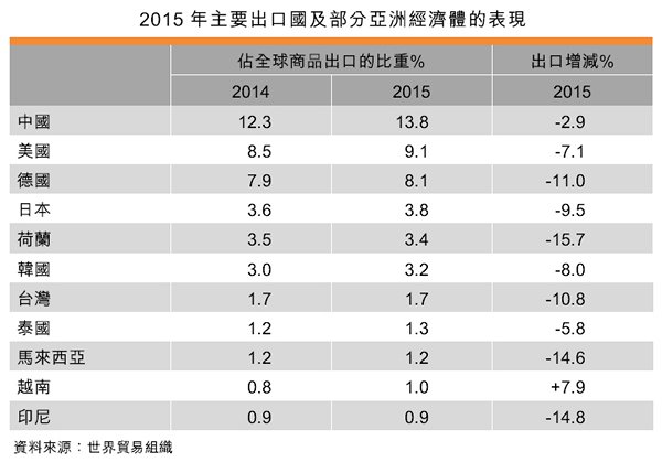據(jù)世界貿(mào)易組織最近發(fā)表的全球貿(mào)易數(shù)字,2015年全球出口總額為165萬億美元,下跌13.2%。2015年中國出口總額減少2.9%,但在主要出口國中跌幅卻屬最小。除越南外,中國出口下跌的速度比亞洲其它生產(chǎn)基地為慢。因此之故,中國占全球商品出口市場(chǎng)的比重,從2014年的12.3%上升到2015年的13.8%。