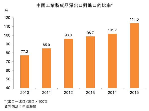 最后裝配工作由中國轉(zhuǎn)移至亞洲其他低成本產(chǎn)地,有助中國擴(kuò)大供進(jìn)一步加工用的原材料及半制成品的出口。根據(jù)中國的統(tǒng)計(jì)數(shù)字,粗略估算,2010至2015年,中國出口的原材料及半制成品復(fù)合年均增長9.1%,高于同期整體出口年均增長7.6%,以及消費(fèi)品年均增長8.3%的速度。