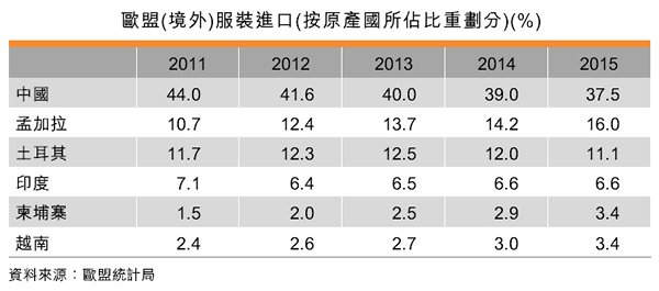 從中國在全球出口市場(chǎng)所占的比重可見中國整體出口仍保持競(jìng)爭(zhēng)力。不過,部分生產(chǎn)活動(dòng)從中國分散至其它生產(chǎn)基地,特別是亞洲其他經(jīng)濟(jì)體,難免影響中國勞動(dòng)密集型或較低增值產(chǎn)品在海外市場(chǎng)所占的比重。服裝方面,中國占美國進(jìn)口的比重由2011年的39.4%降至2015年的37.4%,而越南則是新晉的供應(yīng)國。歐盟進(jìn)口服裝方面,中國所占的市場(chǎng)比重也從2011年的44%下降到2015年的37.5%。