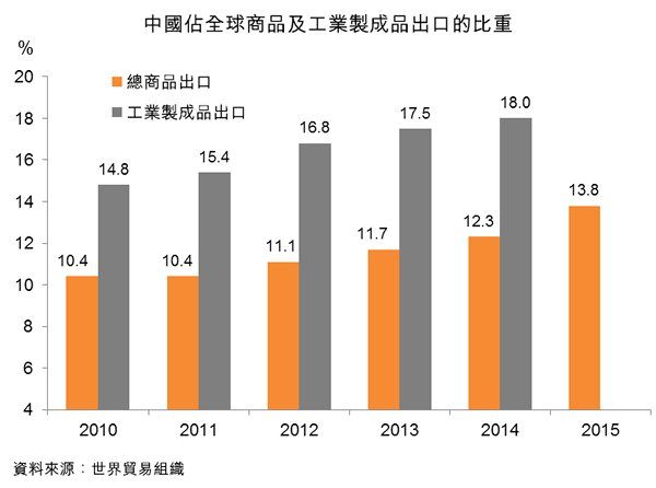 商品出口包括農(nóng)產(chǎn)品、燃料及礦產(chǎn)品。若把出口的范圍收窄到較受生產(chǎn)成本影響的工業(yè)制成品,則世貿(mào)統(tǒng)計(jì)還顯示,近年來,中國占全球工業(yè)制成品出口的比重一直上升,從2010年的14.8%增至2014年的18% [1]。