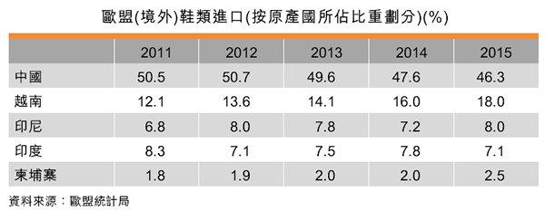 鞋類方面,中國仍占美國進(jìn)口的大部分,不過所占比重已從2011年的73.9%下降到62.5%。歐盟境外進(jìn)口鞋類方面,中國所占的比重從2011年的50.5%下降到2015年的46.3%。此外,越南及印尼均是美國及歐盟主要的進(jìn)口鞋類供應(yīng)國。