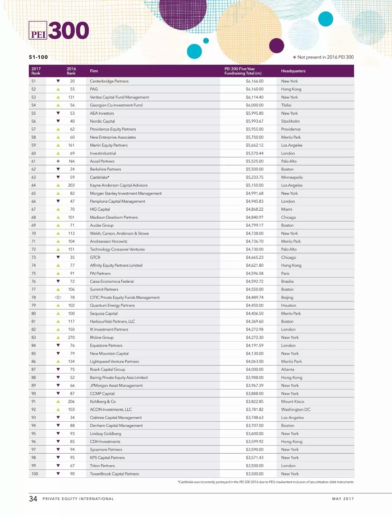 5月7日,倫敦最具權(quán)威的全球另類資產(chǎn)投資(私募股權(quán),債權(quán)投資,房地產(chǎn),etc.) 排名媒體Private Equity International發(fā)布了2016年最新的全球私募股權(quán)機(jī)構(gòu)排名。按照過去五年的融資額進(jìn)行排名,在各個(gè)機(jī)構(gòu)IRR并不透明的今天,融資額作為一個(gè)代表專業(yè)市場(chǎng)認(rèn)可度的指標(biāo),以五年為限,具有相當(dāng)?shù)墓哦取?這里主要提及在中國有業(yè)務(wù)的外資PE以及部分國內(nèi)本土的主流玩家,先看前十七名(將在大陸比較活躍的Silverlake包括進(jìn)來)。