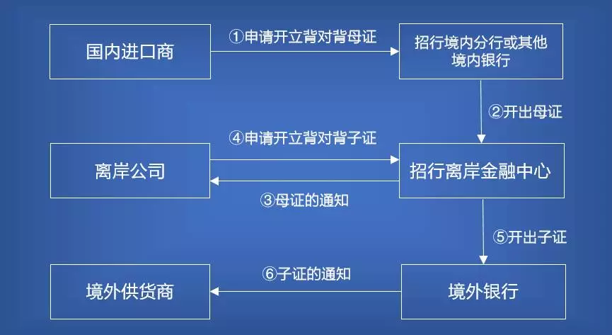 4. 離岸公司向招行離岸金融中心申請(qǐng)開(kāi)立以境外供貨商為受益人的信用證,即“背對(duì)背子證”。