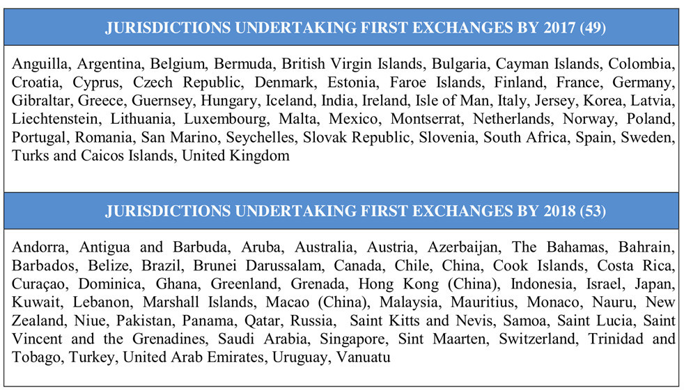 2017年進(jìn)行首次信息交換的管轄區(qū): 開曼群島,塞舌爾,安圭拉,阿根廷,巴巴多斯,比利時,百慕大,英屬維爾京群島,保加利亞,哥倫比亞,克羅地亞,庫拉索島,塞浦路斯,捷克共和國,丹麥,多米尼加,愛沙尼亞,法羅群島,芬蘭,法國,德國,直布羅陀,希臘,格陵蘭,格恩答
