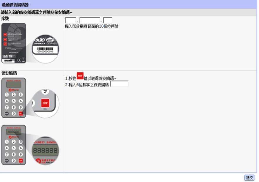 輸入印在保安編碼器機(jī)身后面的10位序號(hào),及使用保安編碼器取得6位數(shù)字的保安編碼。輸入該保安編碼并按提交。