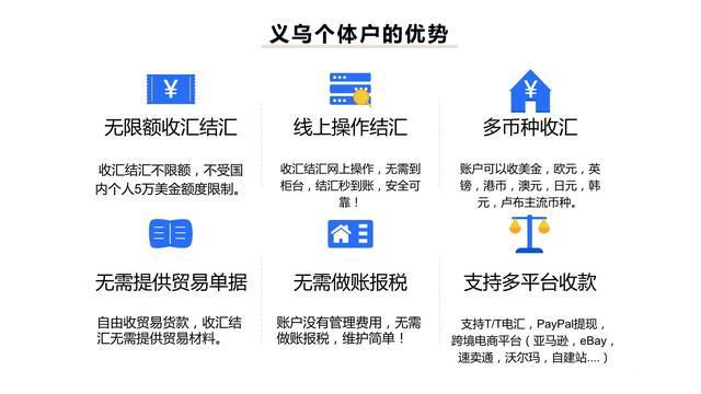 其實早在2014年,國家就頒布了義烏個體戶的政策,義烏個體戶賬戶可享受每年1000萬美金的超大額結(jié)匯?;旧鲜堑扔跓o限額結(jié)匯,并且義烏個體戶也可綁定paypal直接進行提現(xiàn),結(jié)匯出來就可以。這對于外貿(mào)人以及跨境電商從業(yè)者來說肯定最實用的!