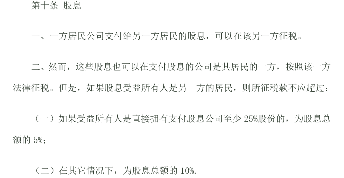 (一)如果受益所有人是直接擁有支付股息公司至少25%股份的,為股息總額的5%。