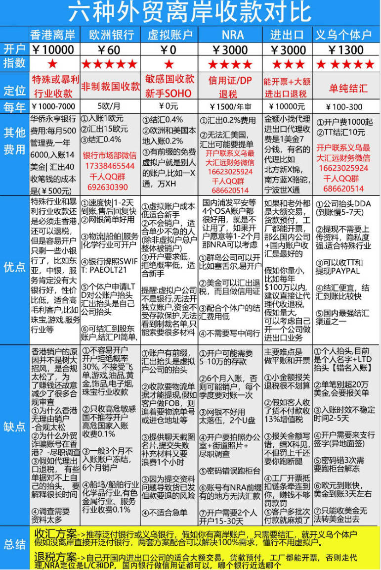 義烏個體戶主要優(yōu)點能無限額結(jié)匯,到賬1-3天,并且開建行還可做虛擬產(chǎn)品(比如游戲幣,谷歌傭金啊等),結(jié)匯無需提供物流和PI,隱私更強. 能收個人的PAYPAL提現(xiàn),缺點是開戶需要本人帶身份證跑支行簽到(全國9個城市支行)缺點②無法退稅和美金轉(zhuǎn)賬.個體戶賬戶可以收匯,但是不可以美金提現(xiàn)轉(zhuǎn)賬,所以如果說你的美金收進來就需要結(jié)匯人民幣那么直接用個體戶賬戶,如果說美金需要匯到工廠退稅或者說國外客戶不接受個人賬戶匯款的情況就用泛付③無法收企業(yè)PP提現(xiàn)④每次備注都要寫中間行,這個比較麻煩!