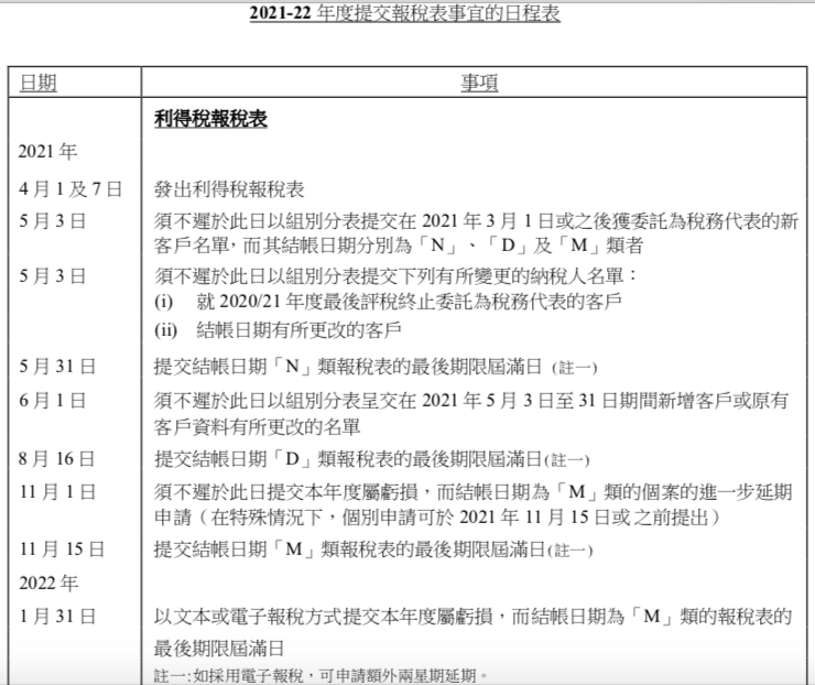 您的香港公司,如果聘請有稅務(wù)代表,那么,提交給稅務(wù)局2020/21年度利得稅報(bào)稅表的期限,可做相應(yīng)延展,具體如下:
