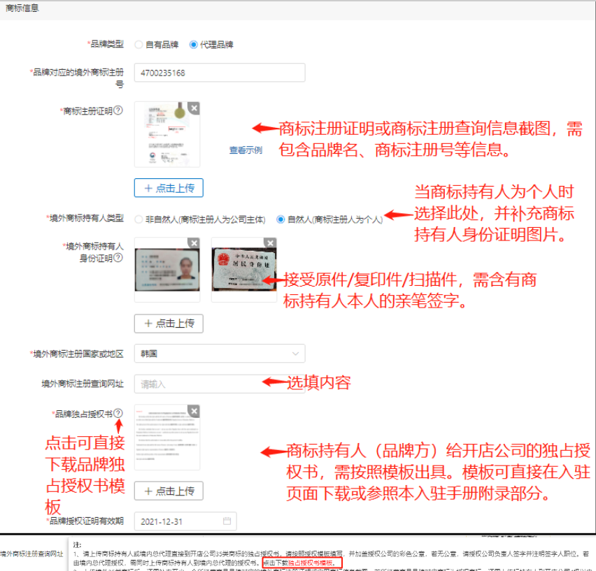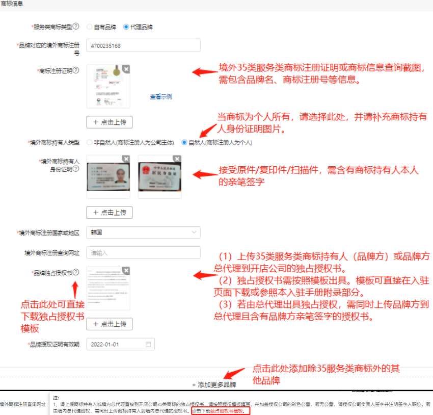 (1)需上傳境外35類(lèi)服務(wù)類(lèi)商標(biāo)注冊(cè)證明或商標(biāo)信息查詢截圖,以及35類(lèi)服務(wù)類(lèi)商標(biāo)持有人(品牌方)或總代理到開(kāi)店公司的獨(dú)占授權(quán)書(shū),授權(quán)書(shū)需按照入駐頁(yè)面或本入駐手冊(cè)附錄的模板出具。若由總代理授權(quán),需同時(shí)上傳品牌方到總代理的授權(quán)書(shū)。