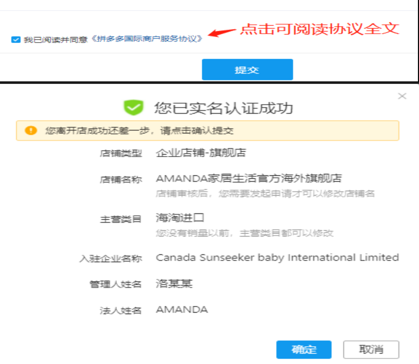 第24頁(yè)勾選我已閱讀并同意《拼多多國(guó)際商戶服務(wù)協(xié)議》,并點(diǎn)擊“提交”。系統(tǒng)會(huì)彈出店鋪信息內(nèi)容,請(qǐng)您認(rèn)真核對(duì)信息,若確認(rèn)無(wú)誤,則點(diǎn)擊“確認(rèn)”;若需要修改,請(qǐng)點(diǎn)擊“取消”重新進(jìn)入編輯。