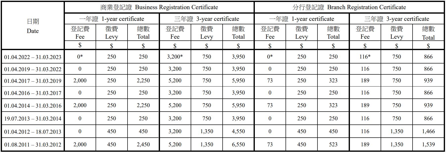 - 就每張登記證須繳付的金額,請(qǐng)參考下面商業(yè)登記費(fèi)及征費(fèi)收費(fèi)表Business Registration Fee and Levy Table。
