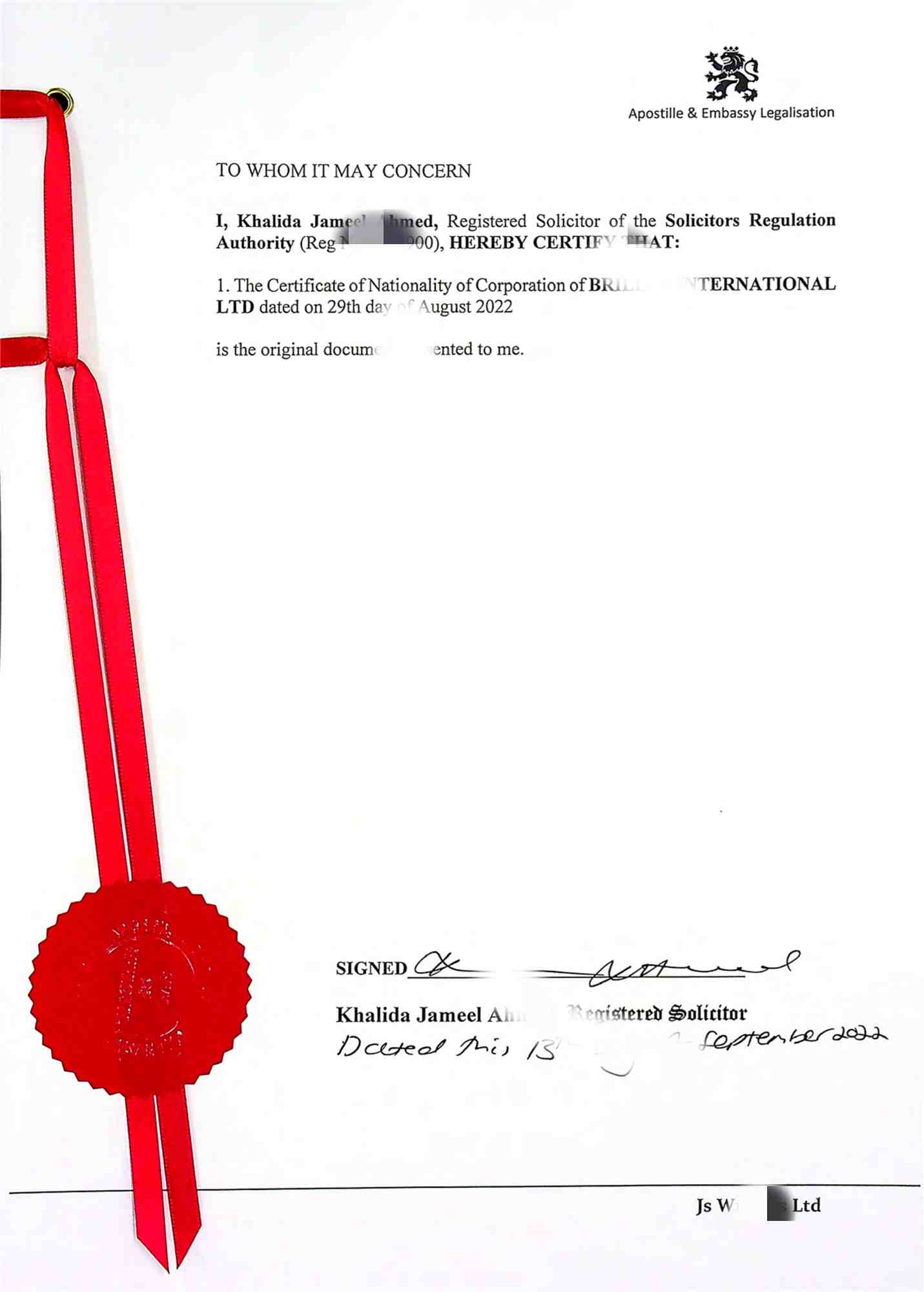 在法院訴訟使用的公證文件,需要對(duì)文件的真實(shí)性進(jìn)行公證認(rèn)證,所以開(kāi)曼公證人會(huì)在開(kāi)曼政府申請(qǐng)注冊(cè)證書(shū),查冊(cè)公司真實(shí)后,再交由英國(guó)工作日認(rèn)證,外交部認(rèn)證,然后由中駐英國(guó)使領(lǐng)館進(jìn)行認(rèn)證。